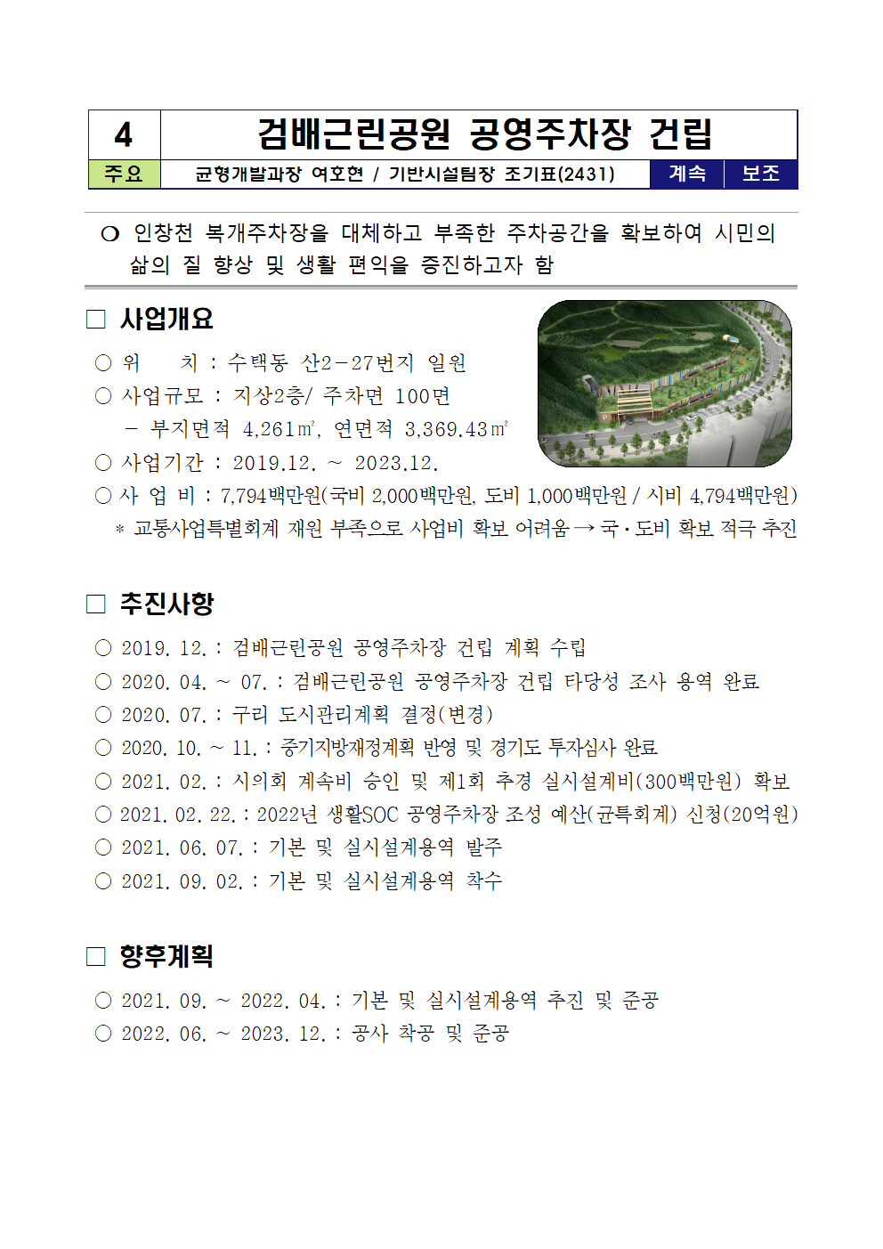 검배근린공원 공영주차장은 시 재정사업으로 추진하며, 현재 실시설계 용역을 발주하여 차근차근 준비하고 있다는 점을 말씀드립니다.