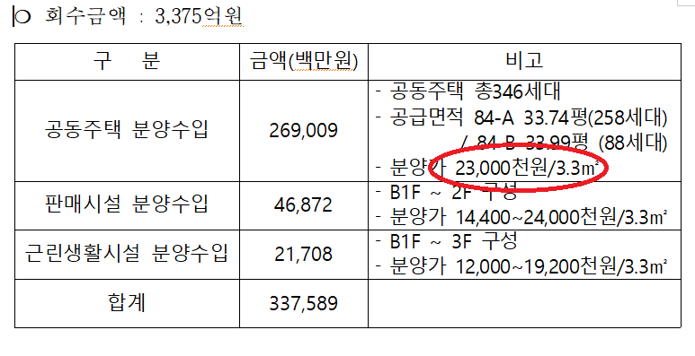 공동주택(346세대) 분양수입으로 약 2690억 원, 판매시설 분양수입, 근린생활시설 분양수입으로 각각 약 468억 원, 217억 원으로 추산됐다. 공급면적 84A(33.74평) 타입 258세대, 84B(33.99평) 타입 88세대로 분양가는 평당 2300만 원이다.