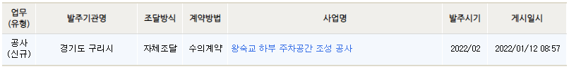 구리시는 왕숙교 하부 주차공간 조성 공사를 위한 발주계획을 게시했다.('22.01.12) 발주시기는 '22년 2월로 예산금액은 75,000천원이다.