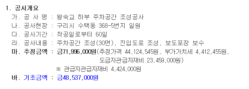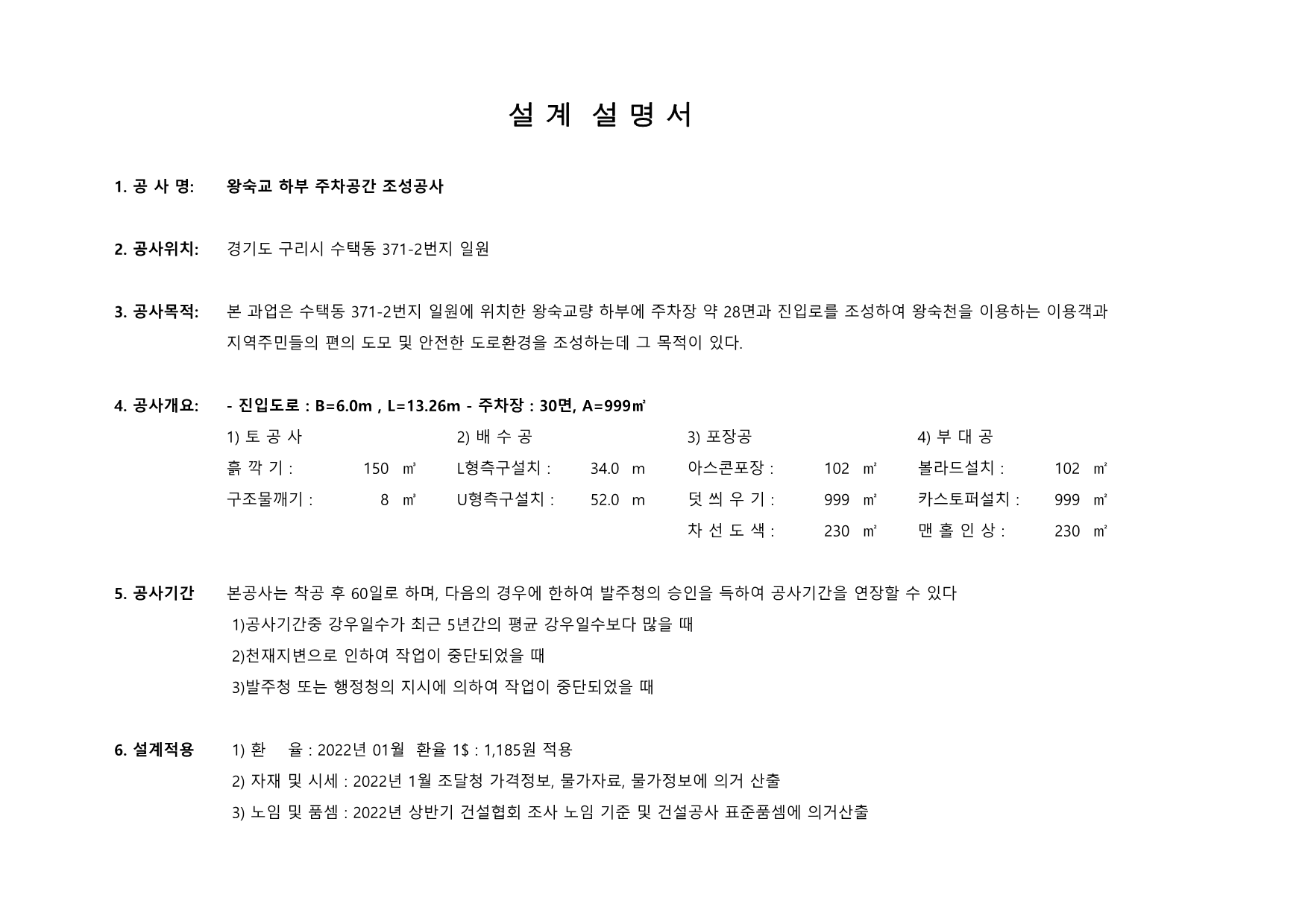 ㅇ 공사목적 : 본 과업은 수택동 371-2번지 일원에 위치한 왕숙교량 하부에 주차장 약 28면과 진입로를 조성하여 왕숙천을 이용하는 이용객과 지역주민들의 편의 도모 및 안전한 도로환경을 조성하는데 그 목적이 있다.