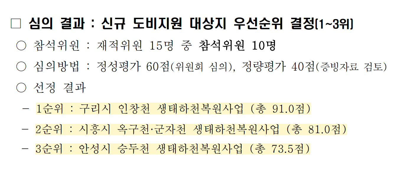 2024년 생태하천복원사업 신규 도비지원 대상지 우선순의 선정을 위한 "제7회 경기도 생태하천복원 위원회" 심의 결과